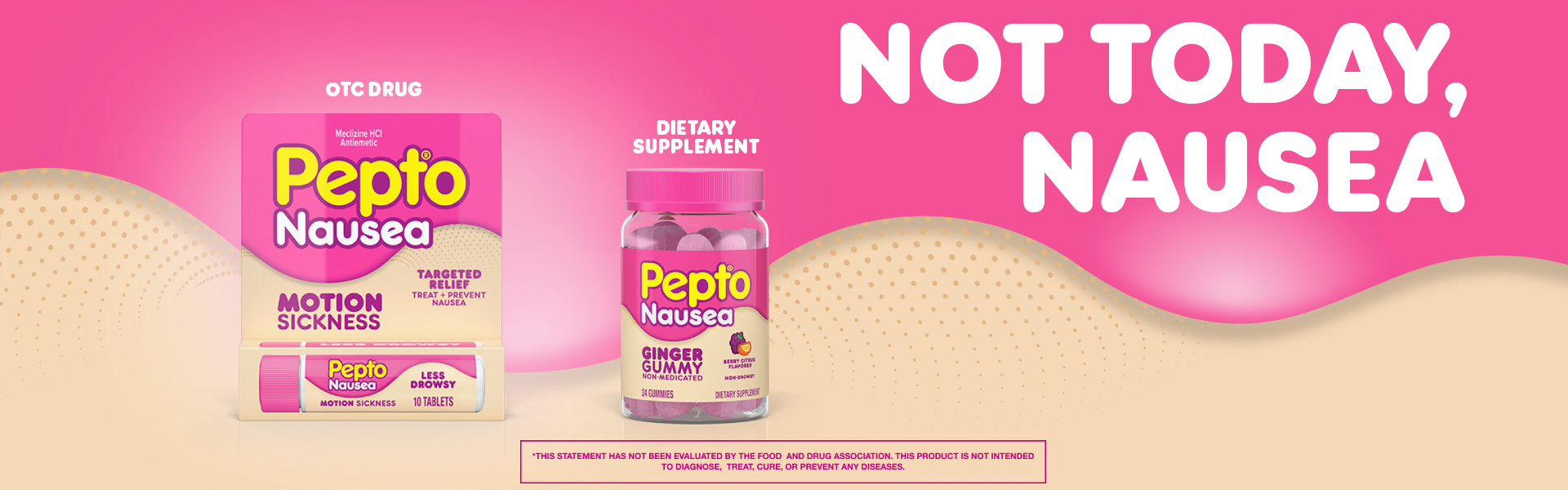 Pepto Nausea Motion Sickness: Pepto Nausea Motion Sickness provides targeted relief to treat and prevent nausea, dizziness, and vomiting from motion sickness. Pepto Nausea Motion Sickness is specifically formulated to prevent your motion sickness symptoms and comes in a convenient travel-ready vial. Take before your adventure begins – and enjoy long-lasting nausea relief. We’ve got you covered for your next bumpy car ride, turbulent flight, twisting roller coaster, or whatever life throws your way. With Pepto Nausea Motion Sickness, you can confidently enjoy the journey and the destination! From the makers of the #1 Pharmacist recommended Upset Stomach Brand^.